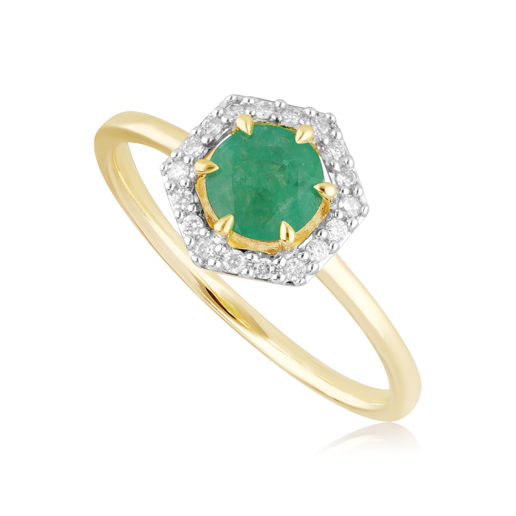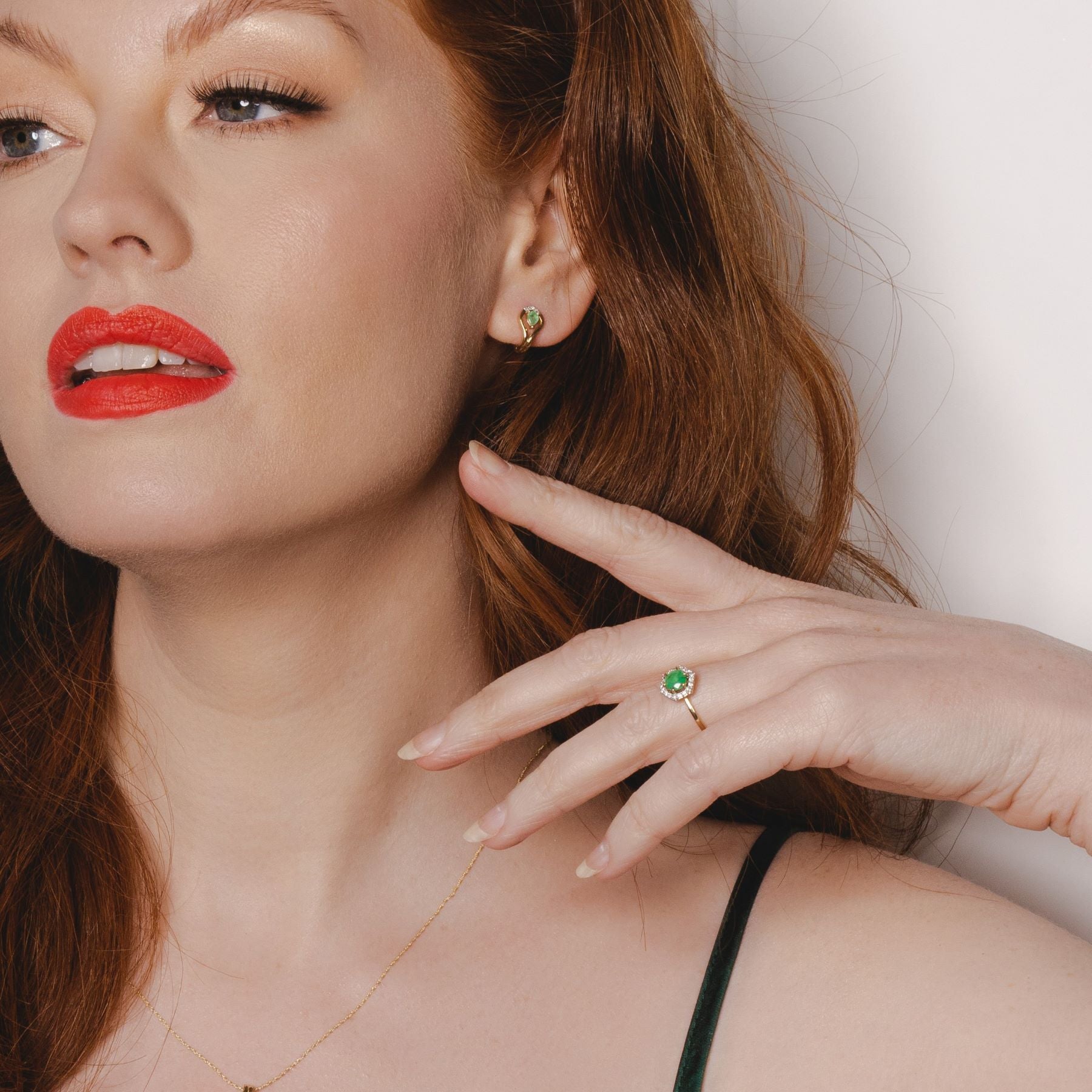 Aggiungi un tocco di colore alle tue dita con questo splendido anello in oro caratterizzato da una splendida gemma focale di smeraldo all'interno di un alone di diamanti. Stai pensando di inginocchiarti? Questo anello in oro 18 ct premium è perfetto per porre la grande domanda.