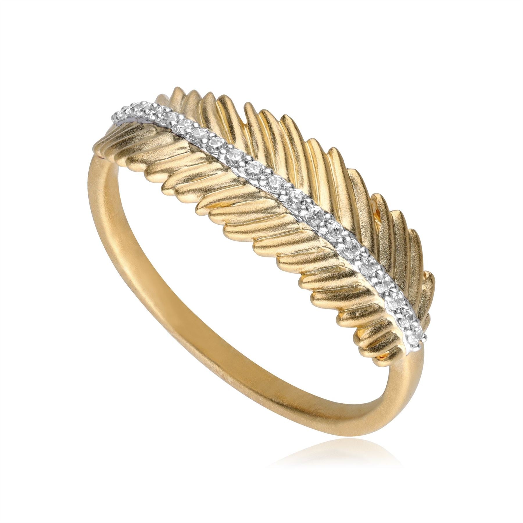 Aggiungi un tocco di eleganza vintage alla tua collezione di gioielli con questo splendido anello con piuma in oro giallo 9k spazzolato, completato da un sofisticato diamante.