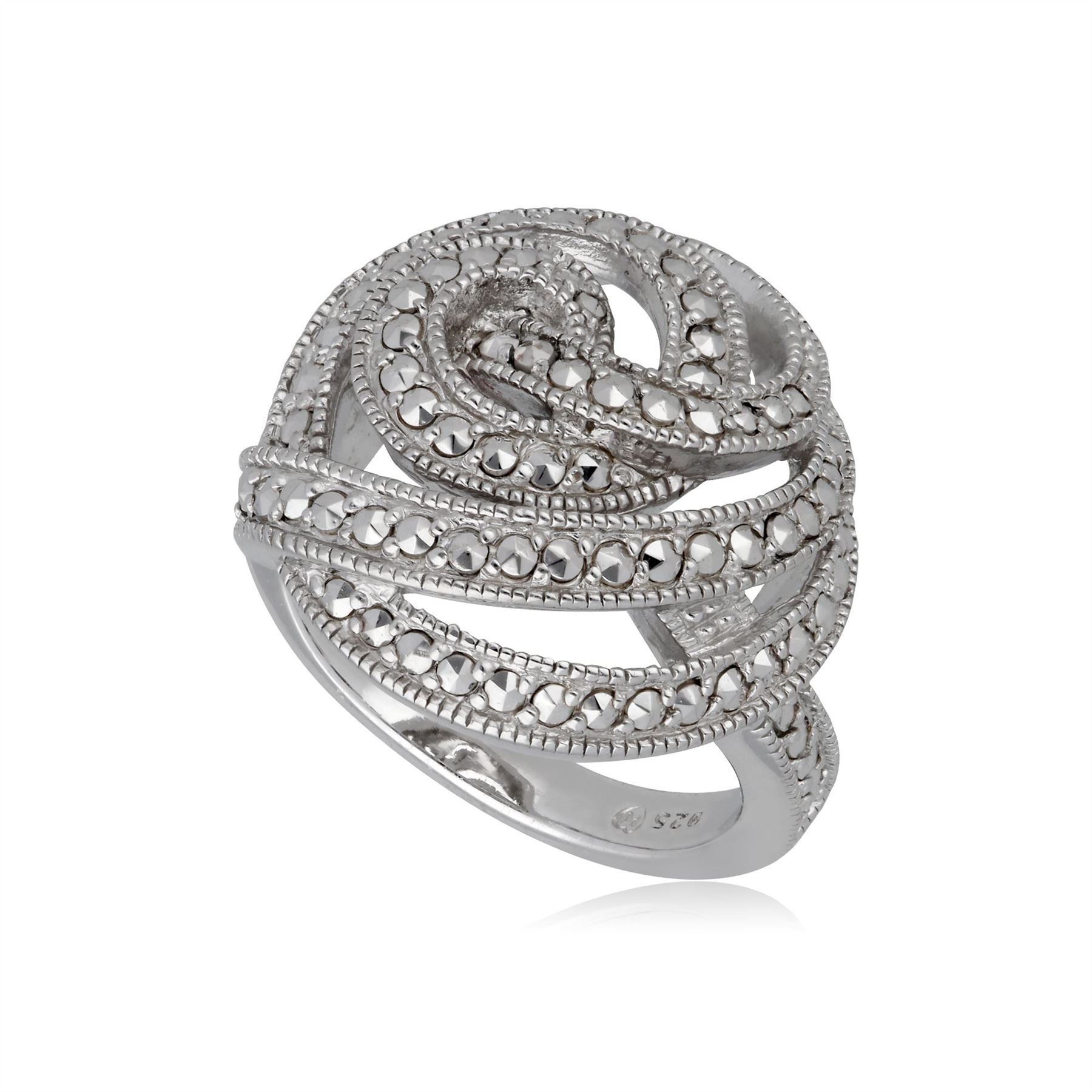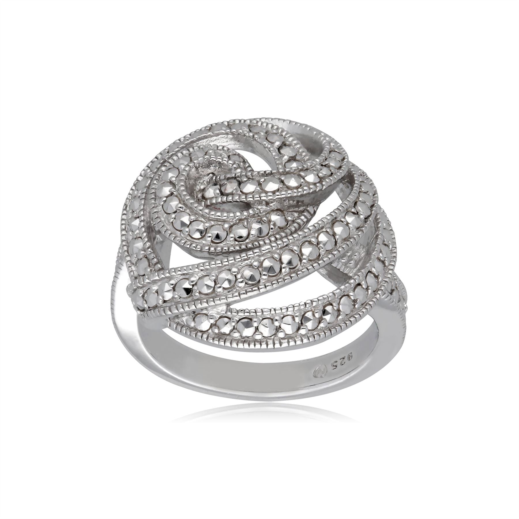 Uno scintillante anello di marcasite con un intricato design vorticoso che farà sicuramente girare la testa. Realizzato in argento sterling e pietre marcasite incastonate a mano, lasciati attirare da questo scintillio ipnotizzante e fai una dichiarazione con questo bellissimo anello da cocktail.