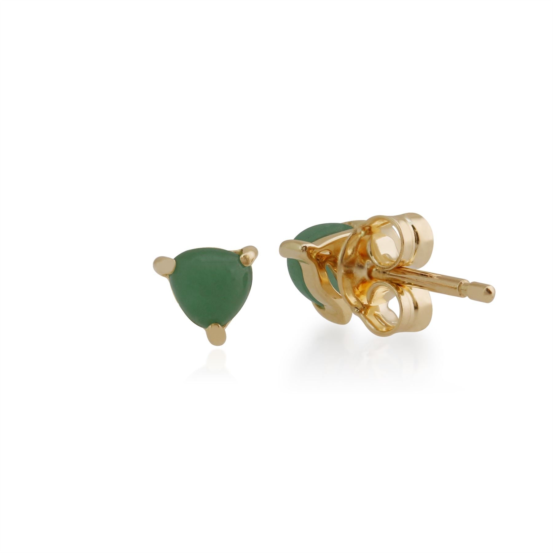 Uno splendido paio di classici orecchini a lobo con pietra singola triangolare realizzati in oro giallo da 9 ct con una gemma di giada verde cabochon con taglio a pera in un'incastonatura a tre griffe.