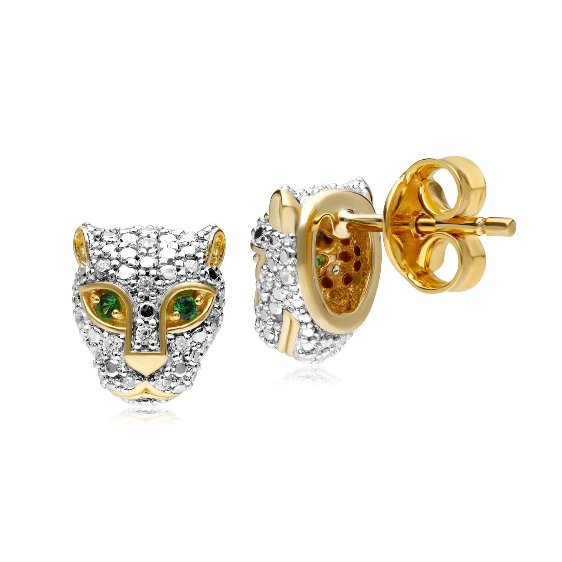 Con seducenti occhi verdi di tsavorite e scintillanti macchie di diamanti, questi orecchini a forma di ghepardo in oro giallo 9k sono stati progettati per essere la star dello spettacolo.