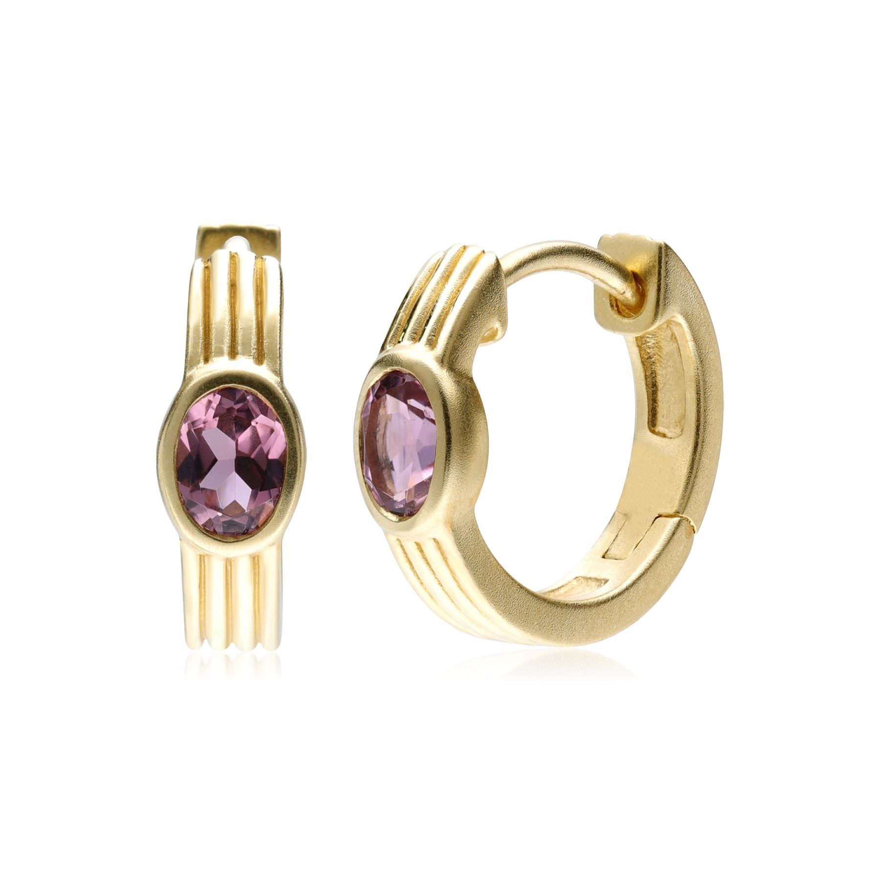 Migliora il tuo look con questi eleganti orecchini a cerchio Huggie con tormalina rosa in oro 9 ct splendidamente spazzolato. Questi orecchini presentano un perno incernierato per le orecchie forate.