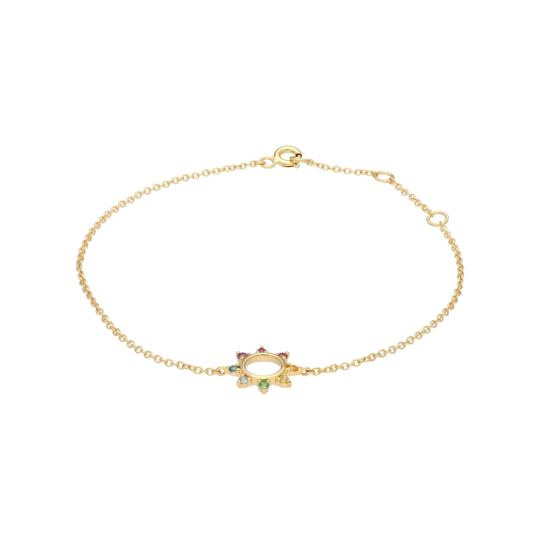 Un giocoso braccialetto arcobaleno pieno di colori espressivi in un motivo solare. Incastonato in argento sterling placcato oro giallo impreziosito da rodolite, tormalina rosa, citrino, tsavorite, peridoto, topazio azzurro e pietre preziose di ametista, questo braccialetto con ciondolo è stato progettato per deliziare. Questo braccialetto ha una lunghezza totale di 16 cm con una prolunga di 3 cm.